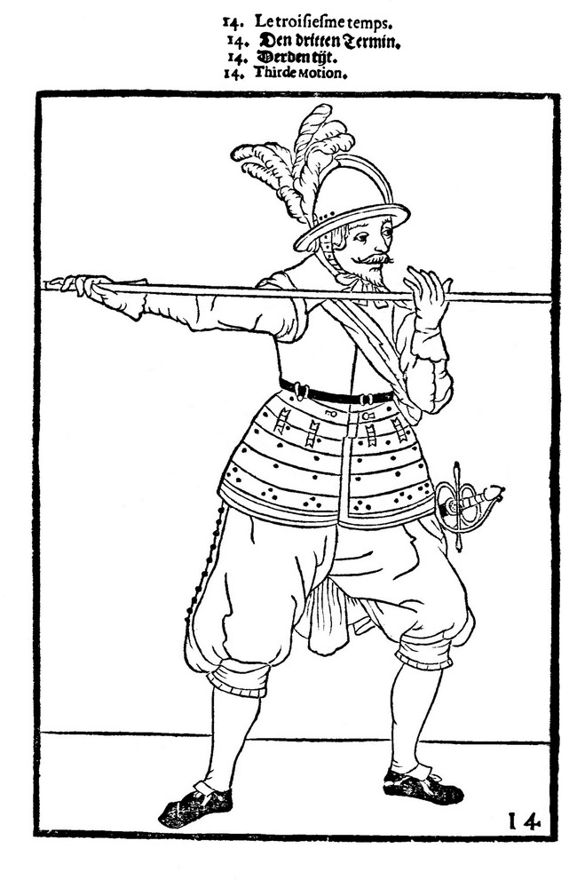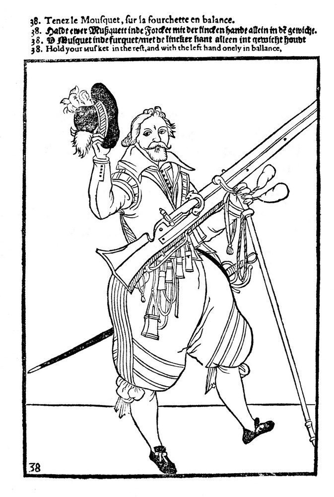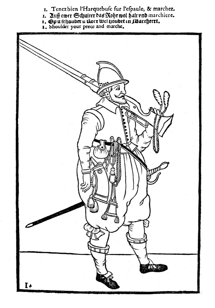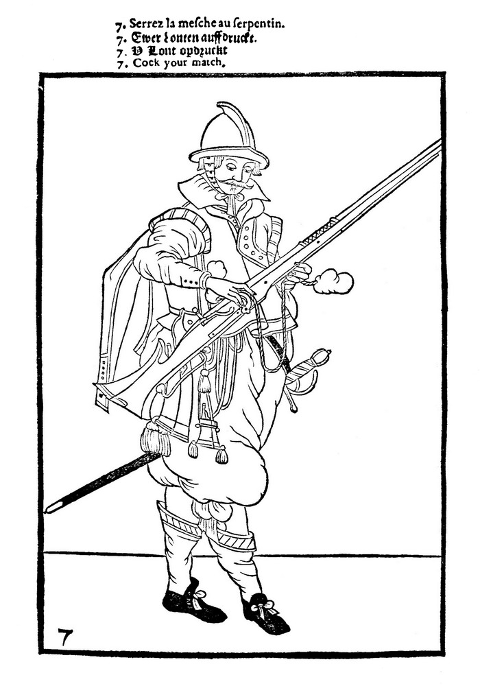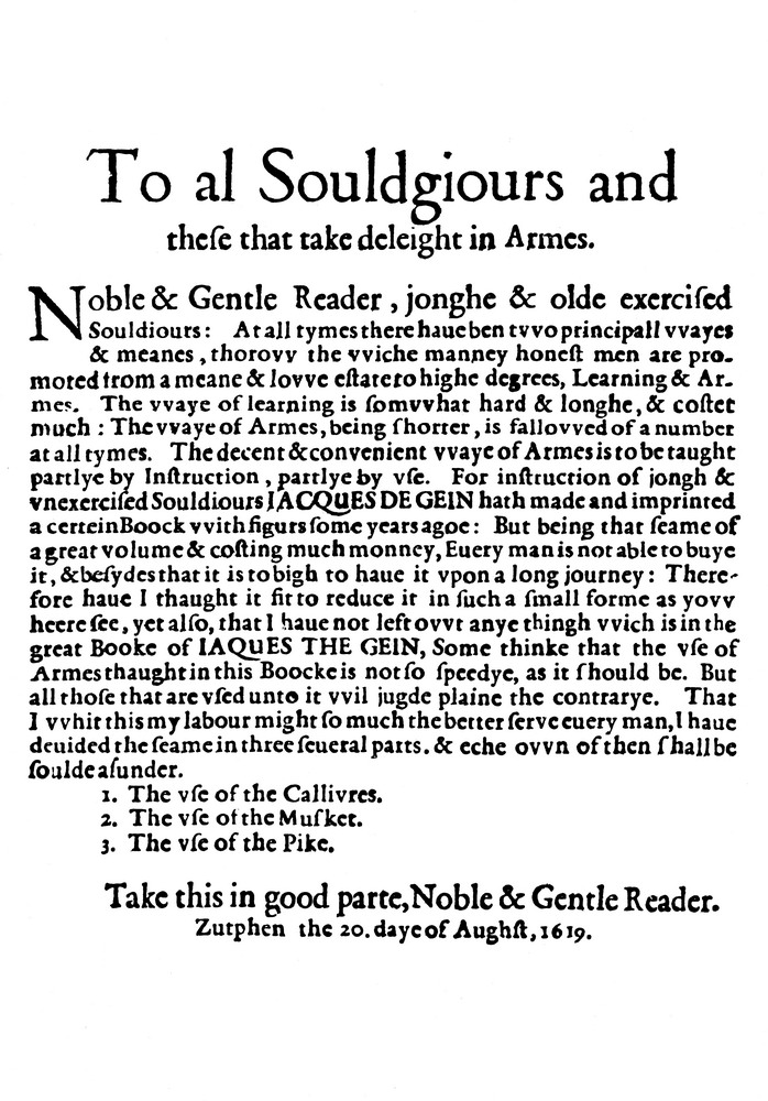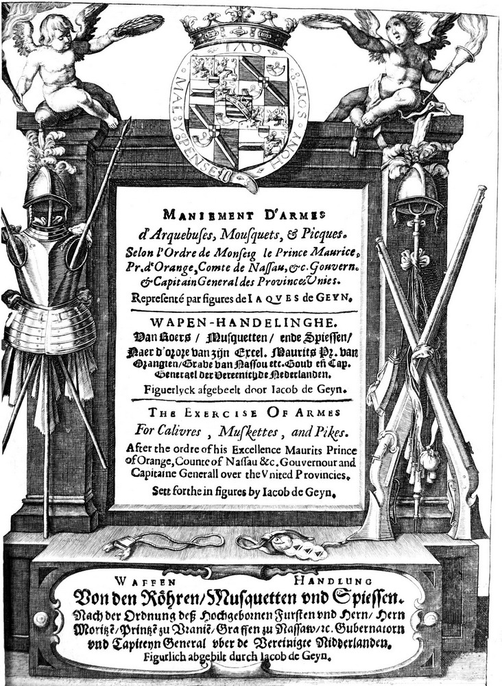 Wapenhandelinghe van Roers Musquetten ende Spiessen was first published in 1607-8 in the Netherlands. Included along with de Gheyn's illustrations were descriptions and commentary and there were Danish, Dutch, English, French, and German editions. Despite the fact that the treatise included very precise instructions to the binder, many surviving editions from 1607-8 are disordered, with sections moved around, engravings placed in the wrong order, text missing, and sometimes even different languages from section to section.