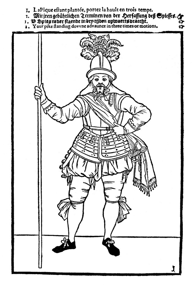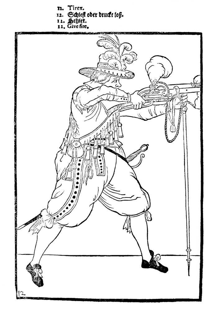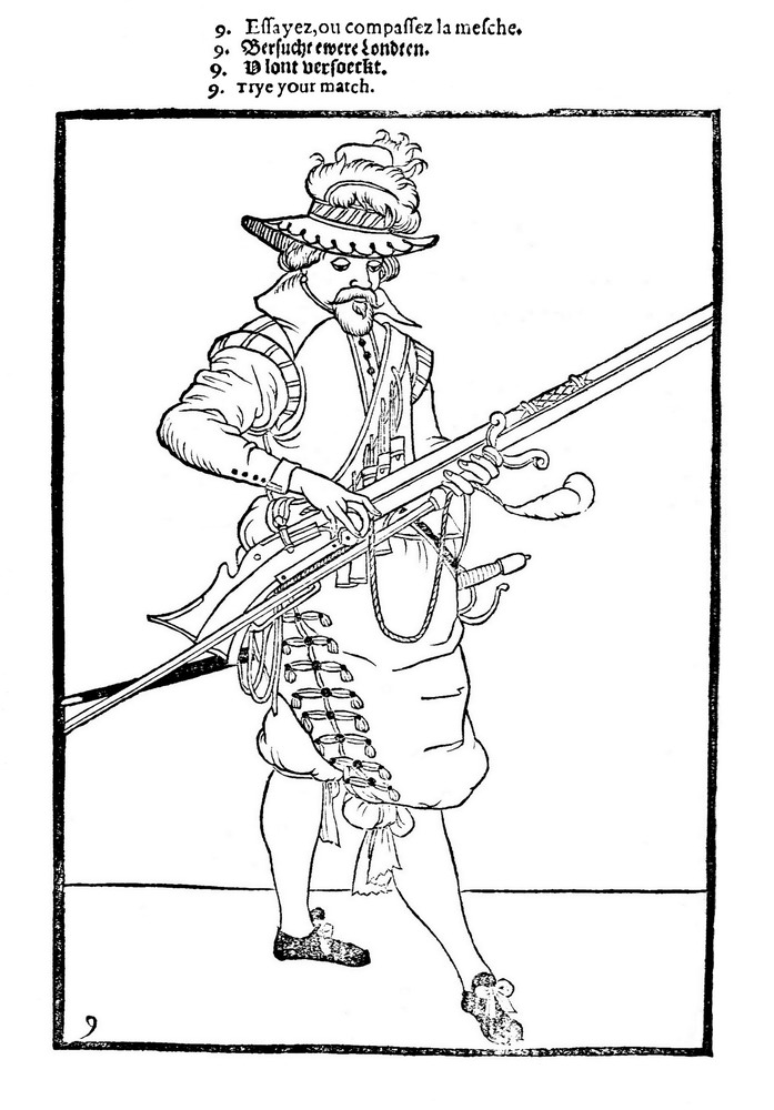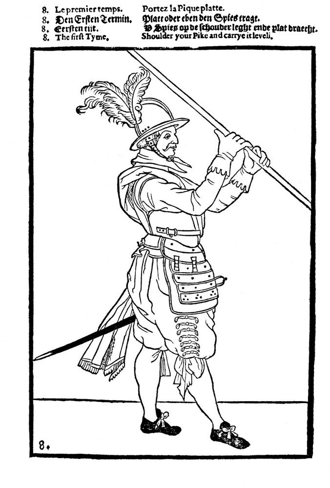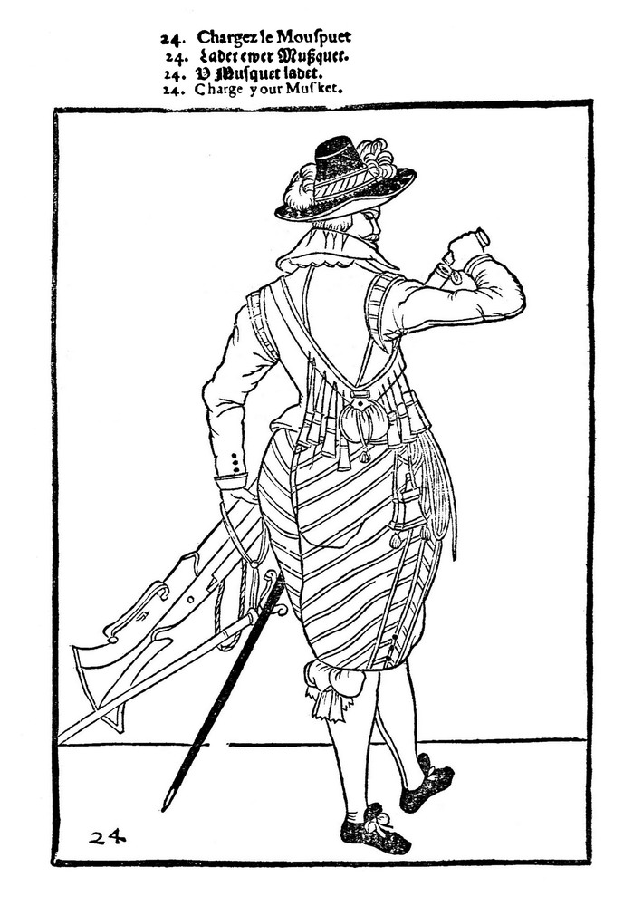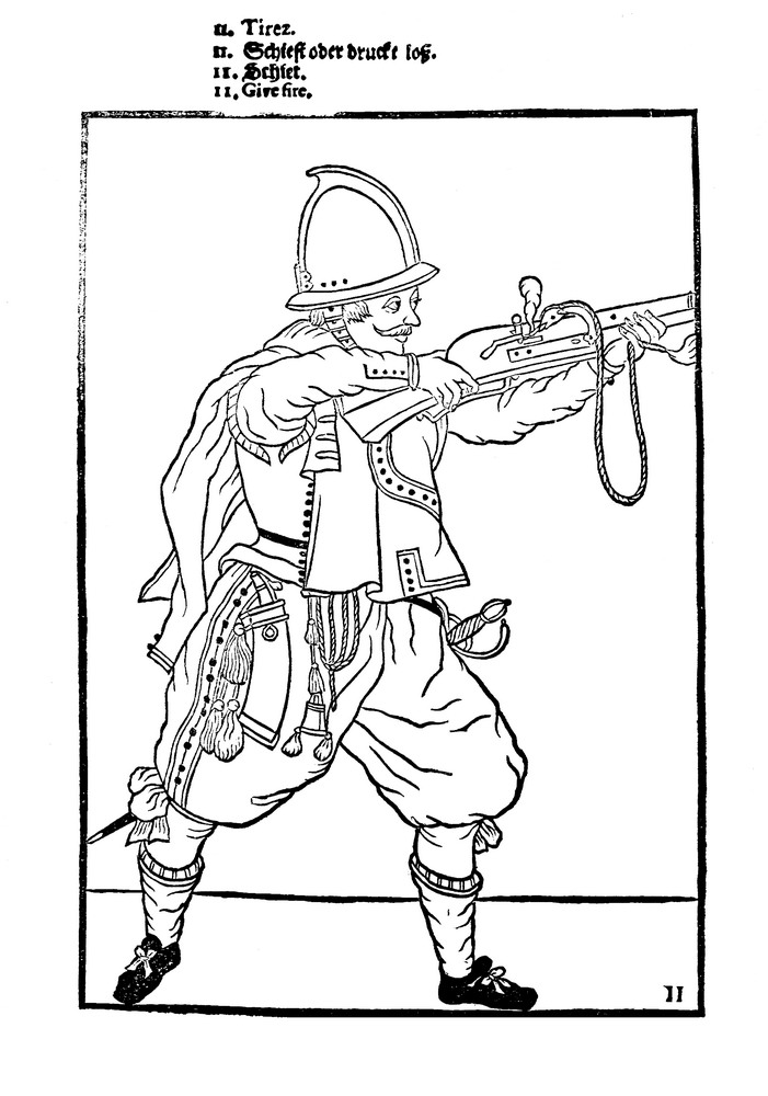 Wapenhandelinghe van Roers Musquetten ende Spiessen was first published in 1607-8 in the Netherlands. Included along with de Gheyn's illustrations were descriptions and commentary and there were Danish, Dutch, English, French, and German editions. Despite the fact that the treatise included very precise instructions to the binder, many surviving editions from 1607-8 are disordered, with sections moved around, engravings placed in the wrong order, text missing, and sometimes even different languages from section to section.