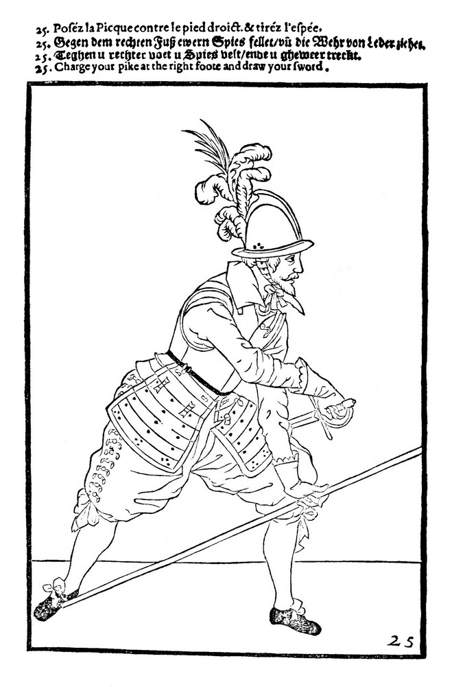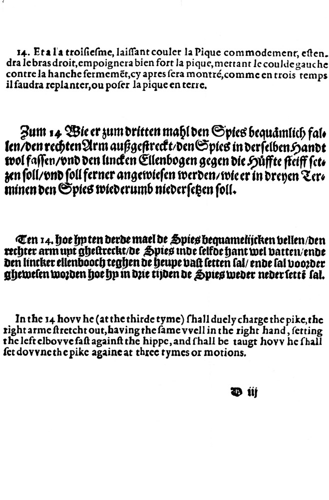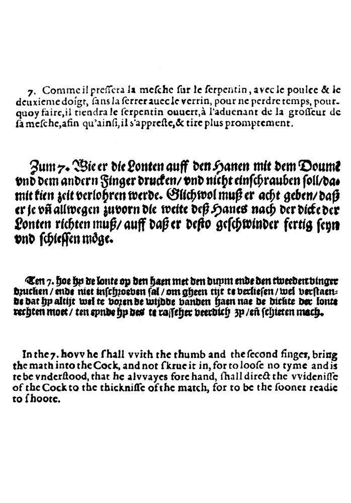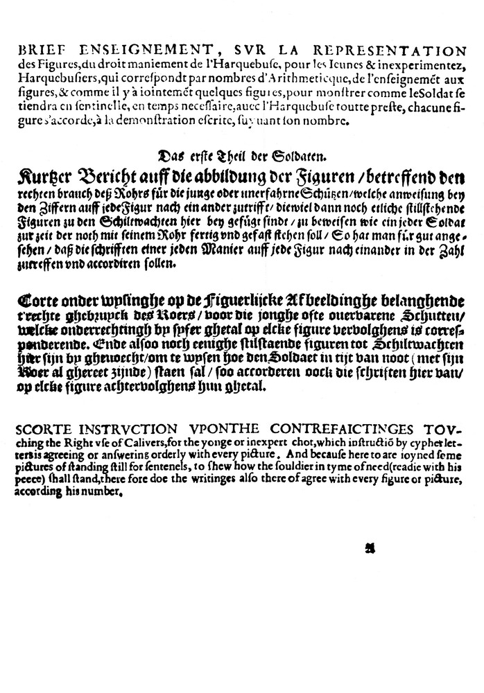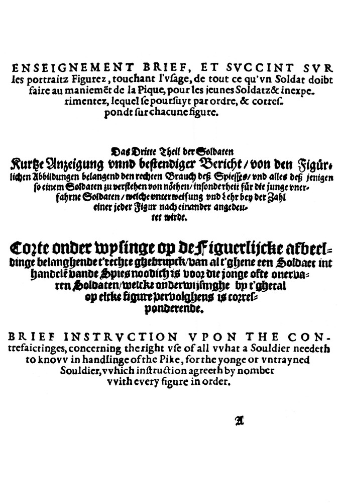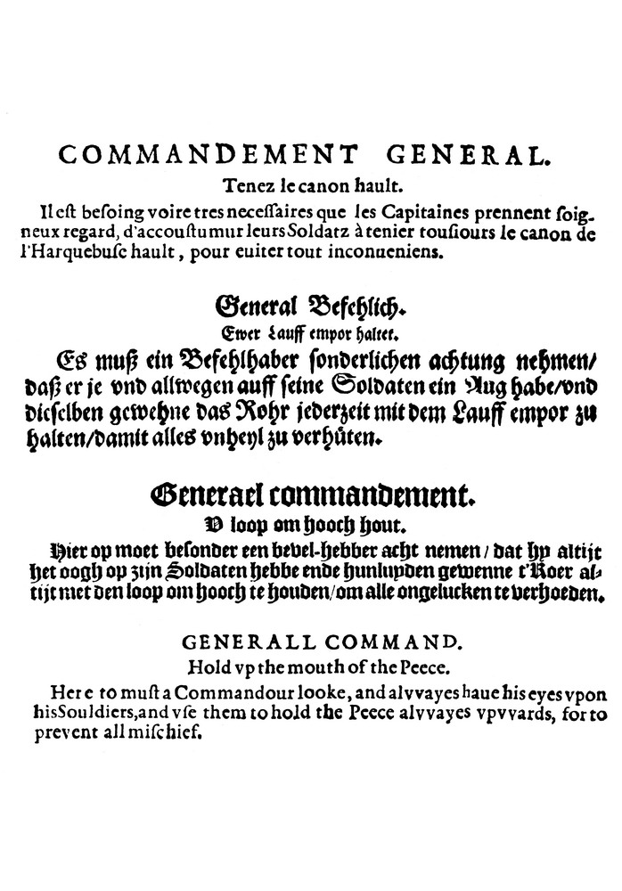 The first multi-language edition, including the French and German texts, was published in Frankfurt in 1609. This edition replaced de Gheyn's elaborate prints with simplified, almost crude, illustrations by an unknown engraver, and placed the commands and descriptions alongside the illustrations (rather than being divided into separate sections, as in the first edition). Editions containing up to four languages followed in later years.
