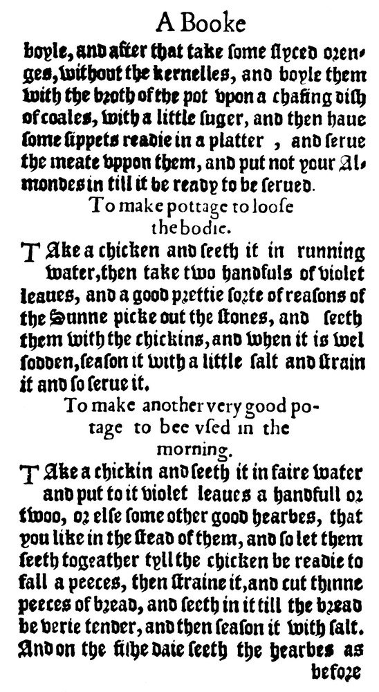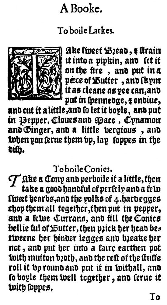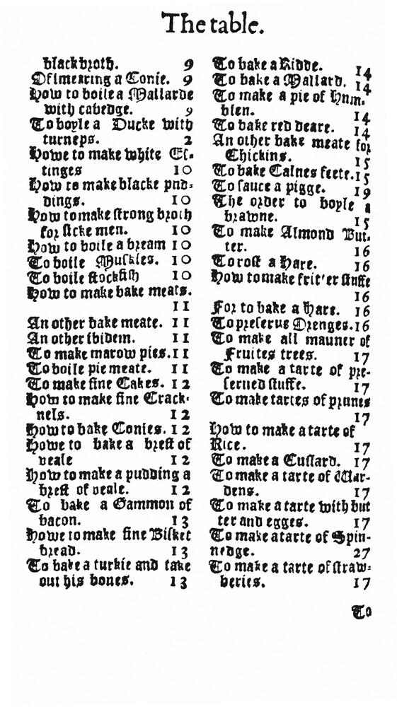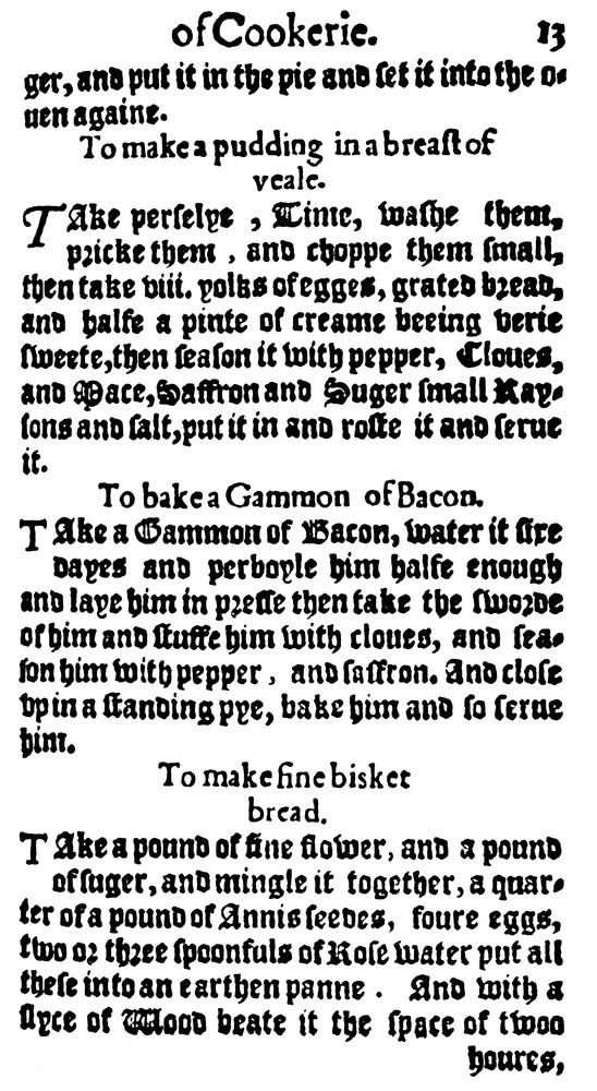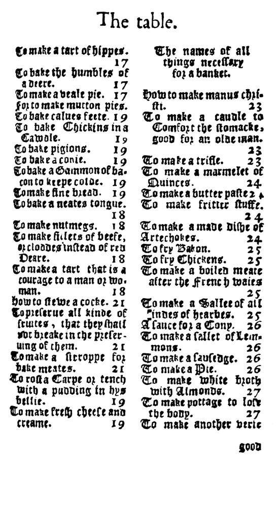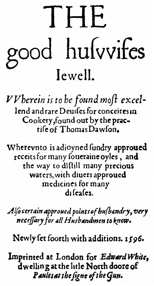 The Good Huswifes Jewell contains over 150 recipes including recipes for medicines and a section on husbandry. It was originally published in 1587 and was re printed in 1596 and 1610
