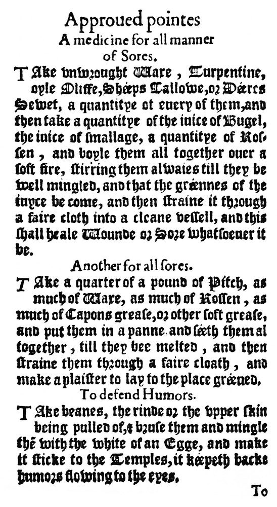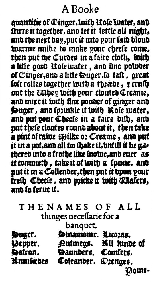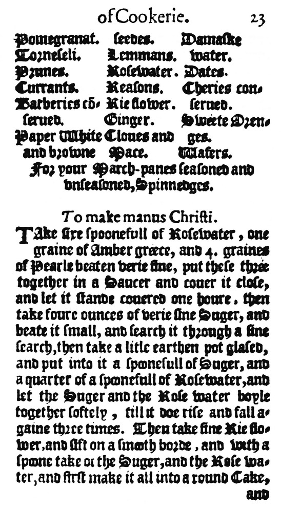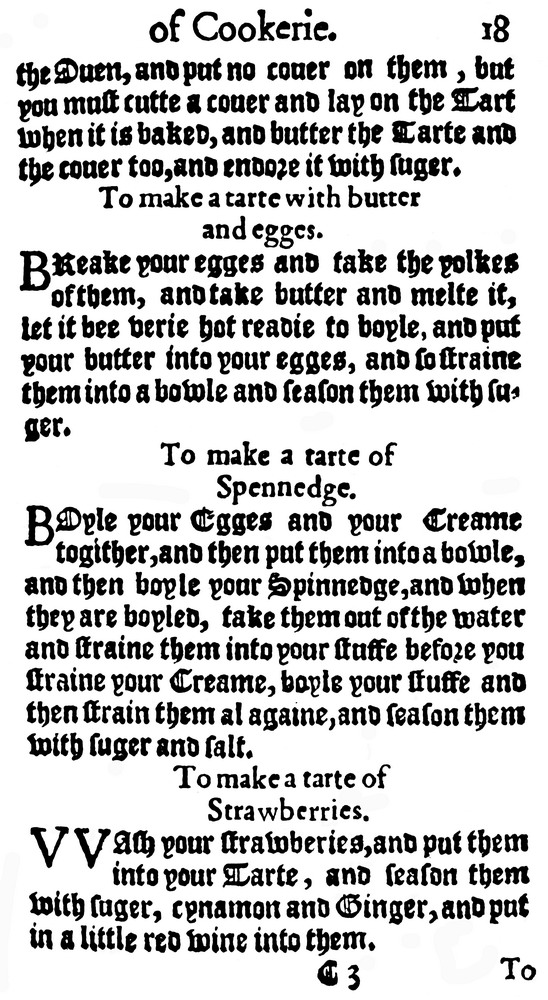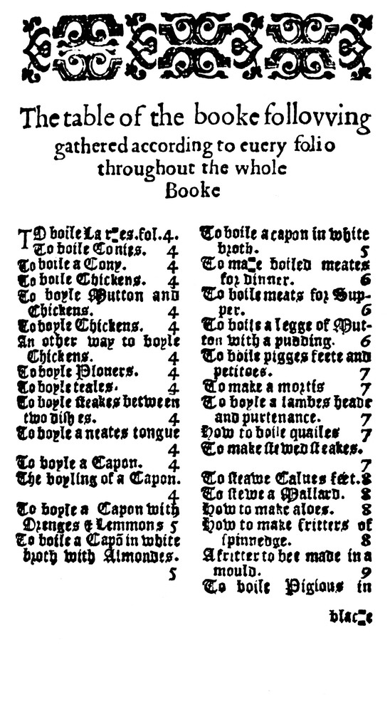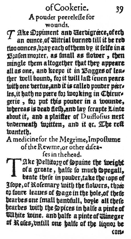 The Good Huswifes Jewell contains over 150 recipes including recipes for medicines and a section on husbandry. It was originally published in 1587 and was re printed in 1596 and 1610