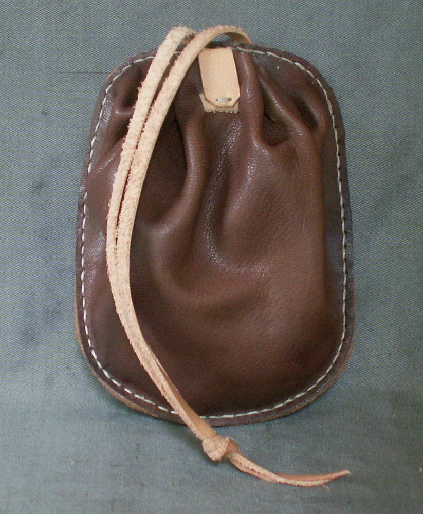 This purse is made from brown goat and calf skin and is stitched by hand. The design for this purse comes from a surviving purse found in Sommelsdijk dated to around 1500. It has a soft goat skin front with a stiffer calf skin back and is held closed with a leather drawstring.