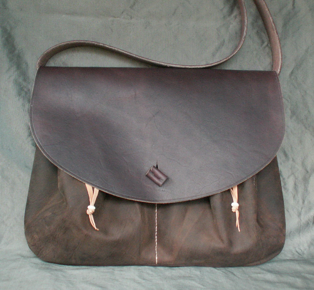 This shoulder bag is made from brown calf skin and is stitched by hand. It has two additional pockets on the front that are kept closed with their own drawstrings. The design for this bag comes from a number of illustrations and is a typical style of shoulder bag between the 14th and 17th centuries.