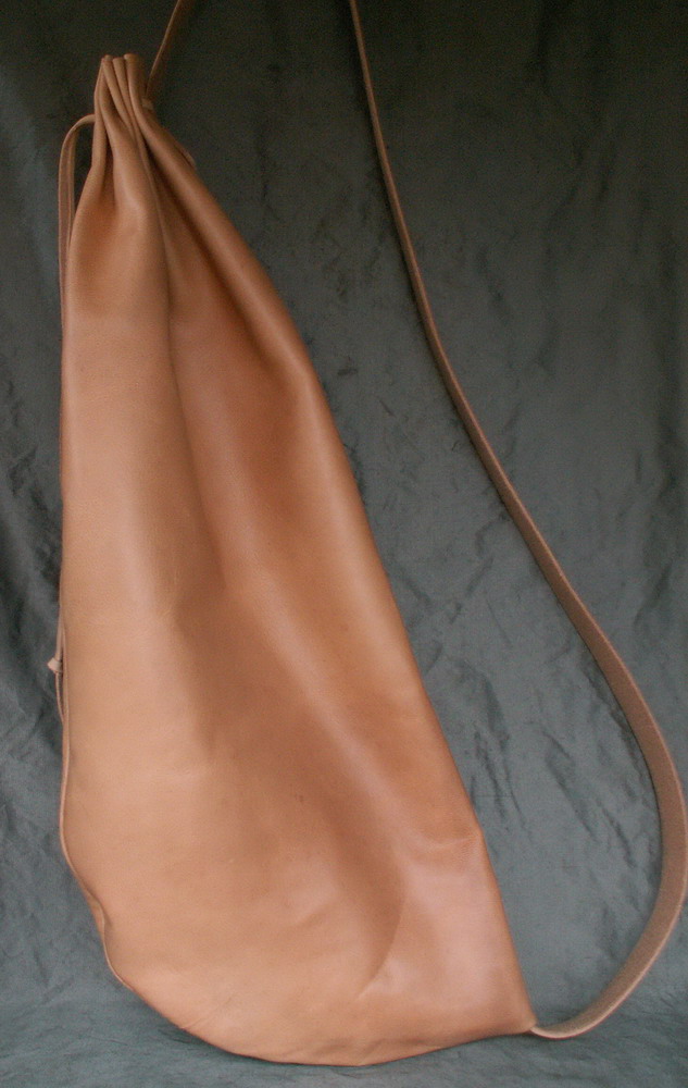 This bag is made from tan goat skin and is stitched by hand. The design for this bag comes from a number of illustrations and is a typical style of shoulder bag between the 14th and 17th centuries. The main seam has a piping strip inserted into it which helps to keep the rain out and the bag is kept closed with a strong leather drawstring and a leather slider.