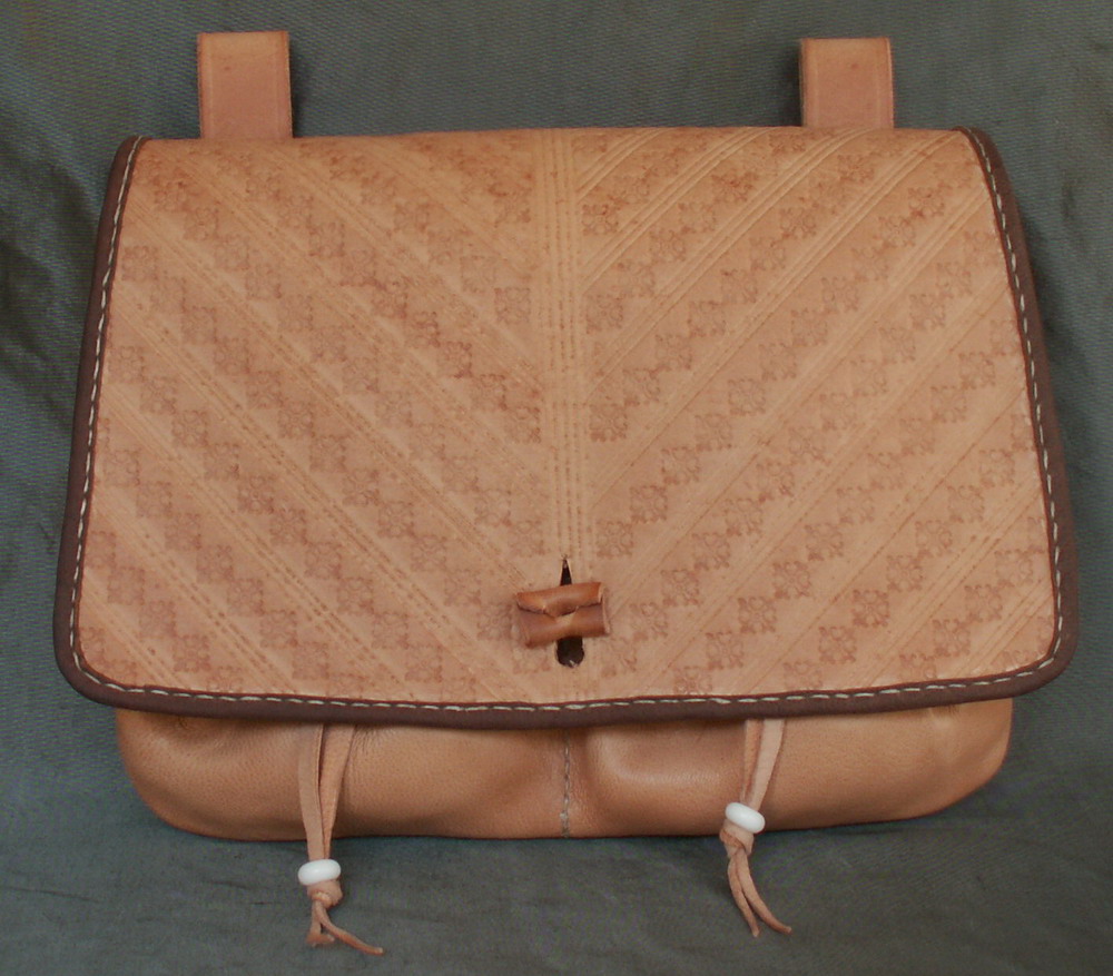This belt wallet is made from tan calf and goat skin and is stitched by hand. It has two additional pouchlets on the front that are kept closed with their own drawstrings. The flap is decorated with a tooling design and the edge is bound with tan goat skin. The design is based on a number of 16th and 17th century illustrations and is a common design in that period.