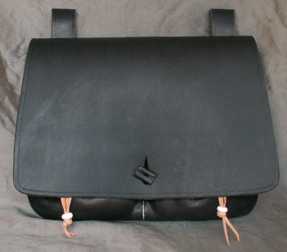 This belt wallet is made from oak gall black calf and goat skin and is stitched by hand. It has two additional pouchlets on the front that are kept closed with their own drawstrings. The design is based on a number of 16th and 17th century illustrations and is a common design in that period.