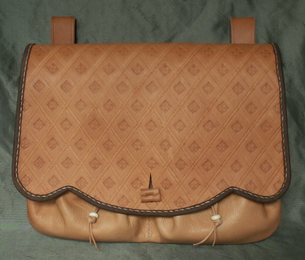 This belt wallet is made from tan calf and goat skin and is stitched by hand. It has two additional pouchlets on the front that are kept closed with their own drawstrings. The flap is decorated with a tooling design and the edge is bound with tan leather. The design is based on a number of 16th and 17th century illustrations and is a common design in that period.