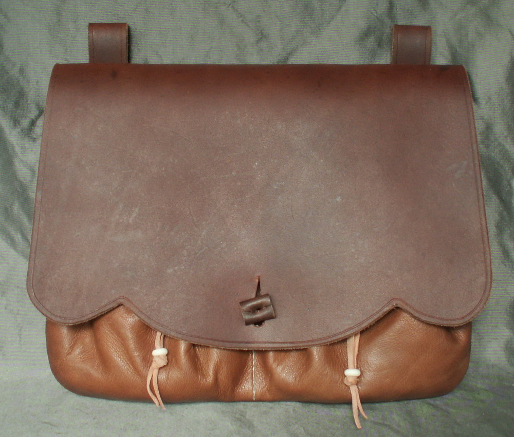This belt wallet is made from brown calf and goat skin and is stitched by hand. It has two additional pouchlets on the front that are kept closed with their own drawstrings. The design is based on a number of 16th and 17th century illustrations and is a common design in that period.