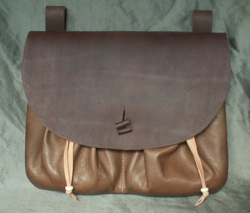 This belt wallet is made from brown calf and goat skin and is stitched by hand. It has two additional pouchlets on the front that are kept closed with their own drawstrings. The design is based on a number of 16th and 17th century illustrations and is a common design in that period.
