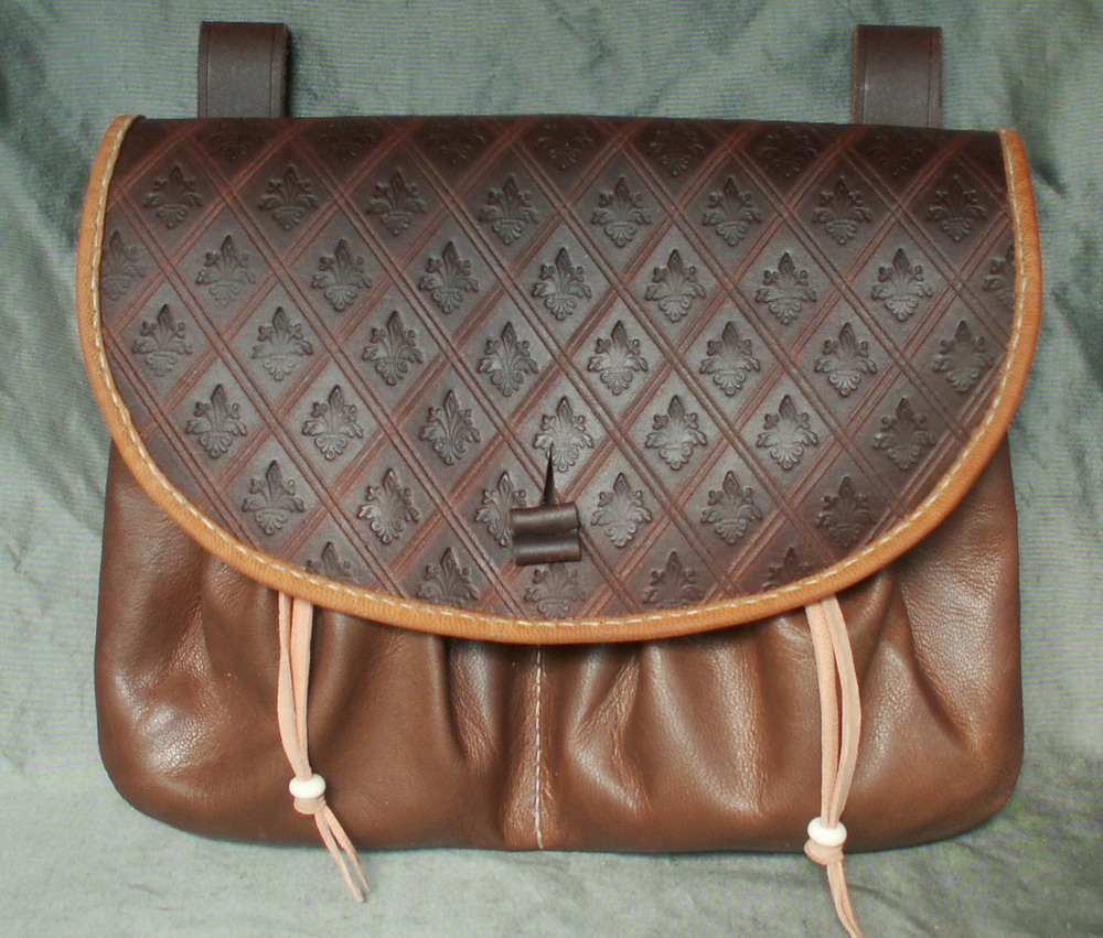This belt wallet is made from brown calf and goat skin and is stitched by hand. It has two additional pouchlets on the front that are kept closed with their own drawstrings. The flap is decorated with a tooling design and the edge is bound with tan leather. The design is based on a number of 16th and 17th century illustrations and is a common design in that period.