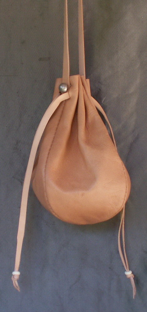 This purse is made from tan goat skin and is stitched by hand. The design for this purse comes from number of paintings and illustrations and is a common style from the 14th to the 17th centuries. It hangs from a leather cord and the top is held closed by two leather draw strings which have hand made beads on the ends.