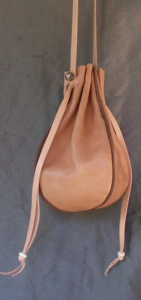 This purse is made from tan goat skin with brown piping and is stitched by hand. The design for this purse comes from number of paintings and illustrations and is a common style from the 14th to the 17th centuries. It hangs from a leather cord and the top is held closed by two leather draw strings which have hand made beads on the ends.