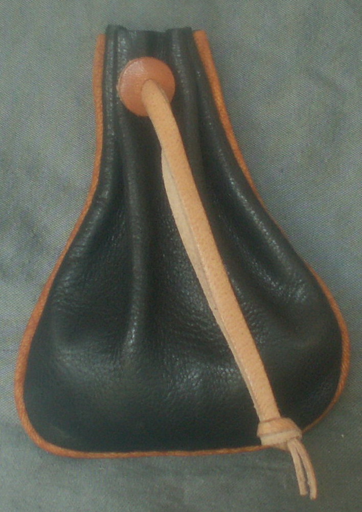 This purse is made from oak gall black goat skin with tan piping and is stitched by hand. It has a leather drawstring and is kept closed with a leather slider.