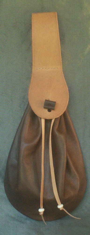 This purse is made from brown goat and tan calf skin and is stitched by hand. The design for this purse comes from "Peasants Before an Inn" by Jan Steen 1653 and is a typical 17th century style. It has a draw string fronted bag with a stiff calf leather back and belt loop. The bag is kept close with a drawstring that has hand made beads on the ends and is covered with a button flap.