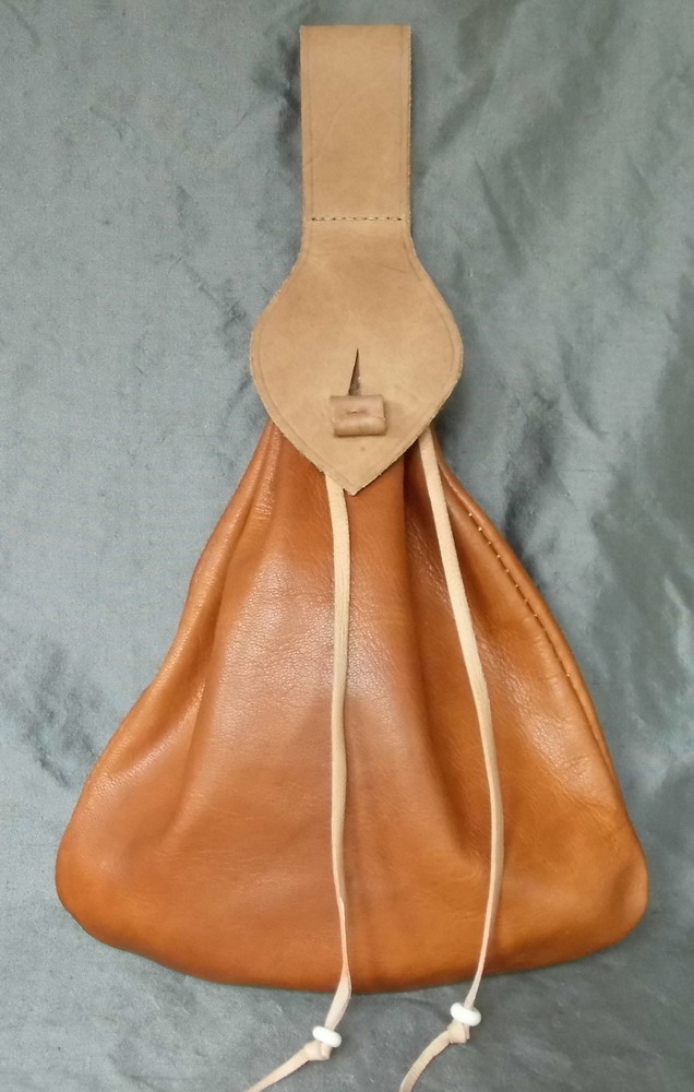 This belt bag is made from tan goat and tan calf skin and is stitched by hand. The design for this bag comes from illustrations in Boccaccio's Decameron 1430 and is a common style in the 15th and 16th century. It has a draw string bag that is held closed with a button flap and hangs from a belt loop. The drawstrings have hand made beads on the ends.
