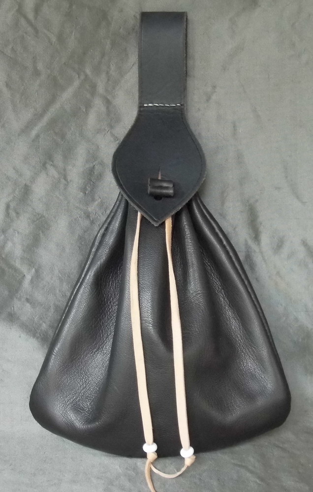 This belt bag is made from oak gall black goat and calf skin and is stitched by hand. The design for this bag comes from illustrations in Boccaccio's Decameron 1430 and is a common style in the 15th and 16th century. It has a draw string bag that is held closed with a button flap and hangs from a belt loop. The drawstrings have hand made beads on the ends.