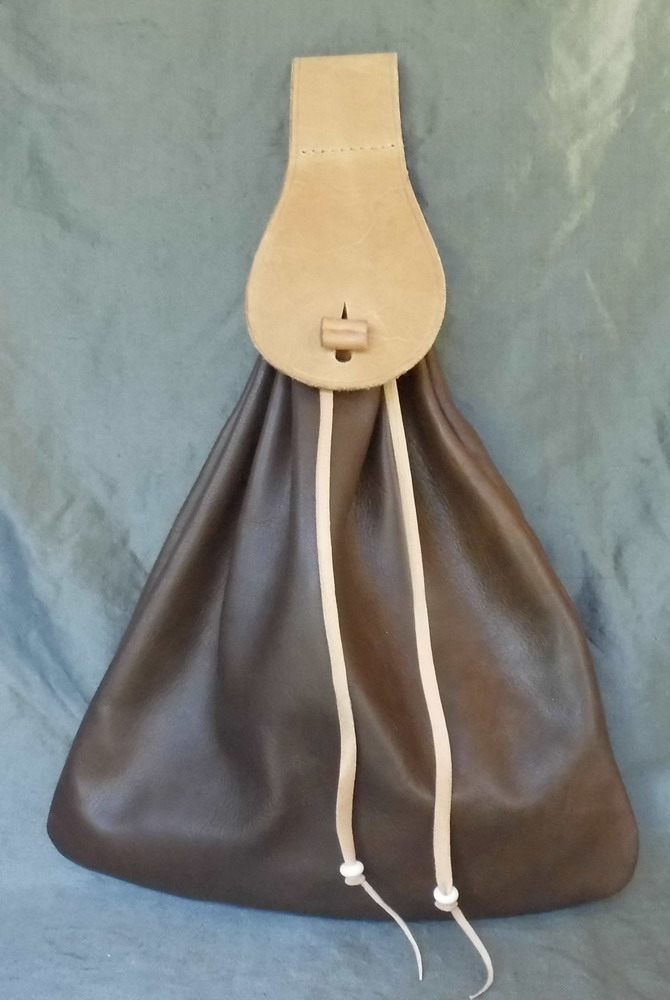 This belt bag is made from brown goat and tan calf skin and is stitched by hand. This design is based on a figure in 'Flemish Proverbs' by Pieter Bruegel painted in 1559 and is a common design in the 15th and 16th centuries. It has a draw string bag that is held closed with a button flap and hangs from a belt loop. The drawstrings have hand made beads on the ends.