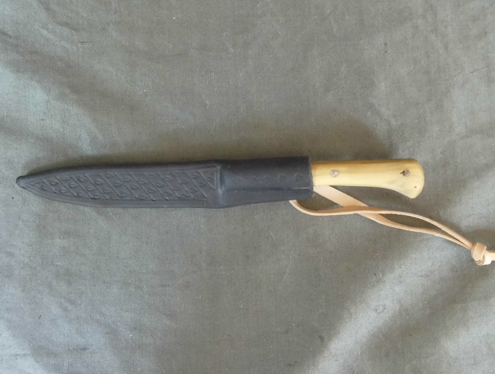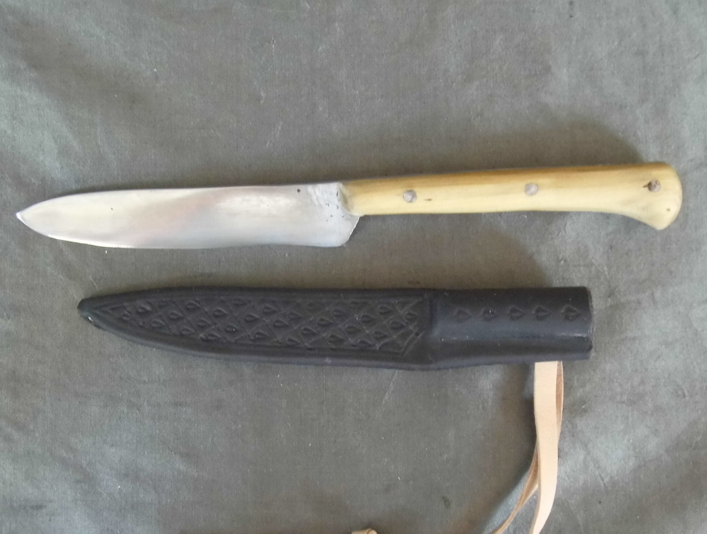 This scale tang eating knife is hand forged and has a boxwood handle. The sheath is made from oak gall black calf skin that has been wet moulded, stitched by hand and decorated with an incised line and stamped design. It has a leather thong so it can be carried on a belt.