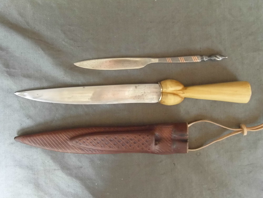 This bollock knife and bolstered eating knife are hand forged. The bollock knife has a boxwood handle and the eating knife has a steel blade and a wrought iron handle. The sheath is made from brown calf skin that has been wet moulded, stitched by hand and decorated with an incised line and stamped design. It has a leather thong so it can be carried on a belt.