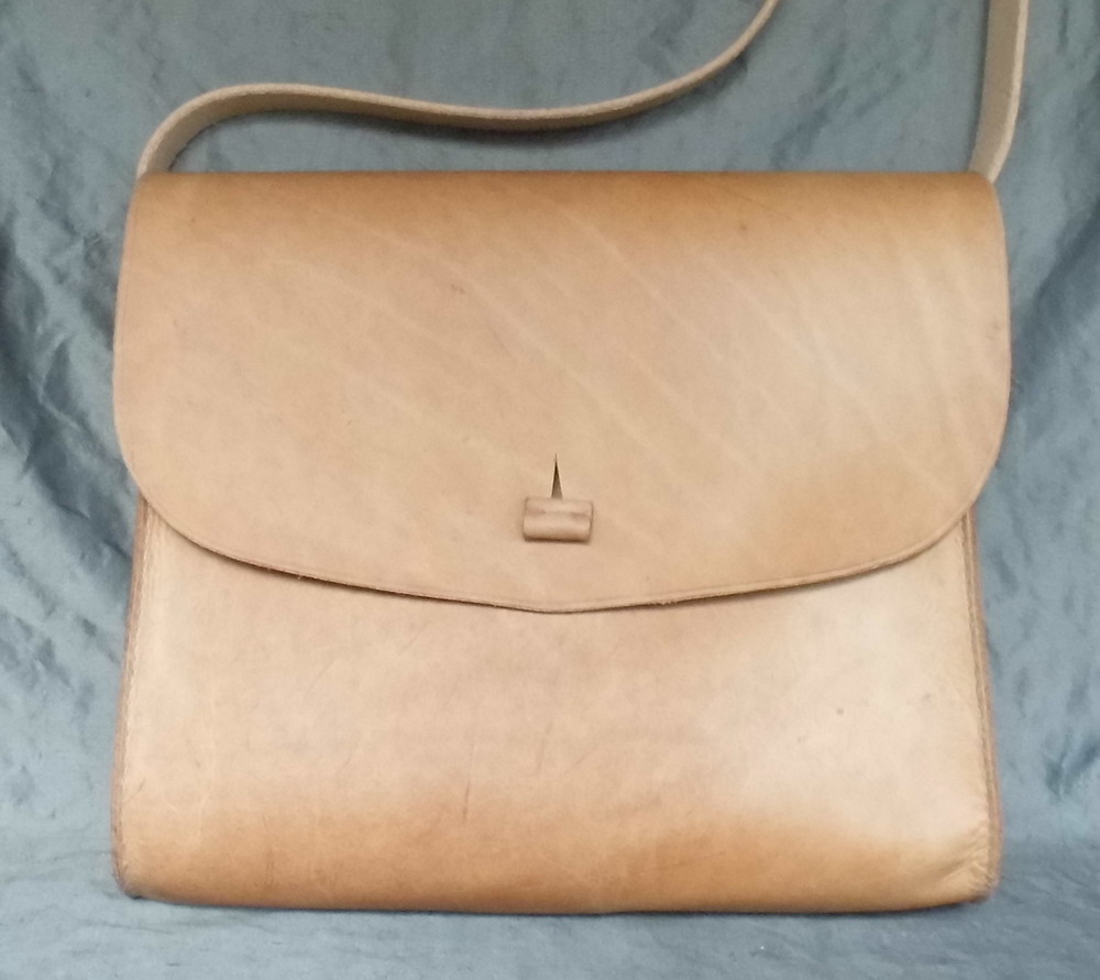 This shoulder bag is made from tan calf skin and is stitched by hand. The design for this bag comes from a number of illustrations and is a typical style of shoulder bag between the 14th and 17th centuries. It has gussets stitched into the sides which gives more room inside the bag.