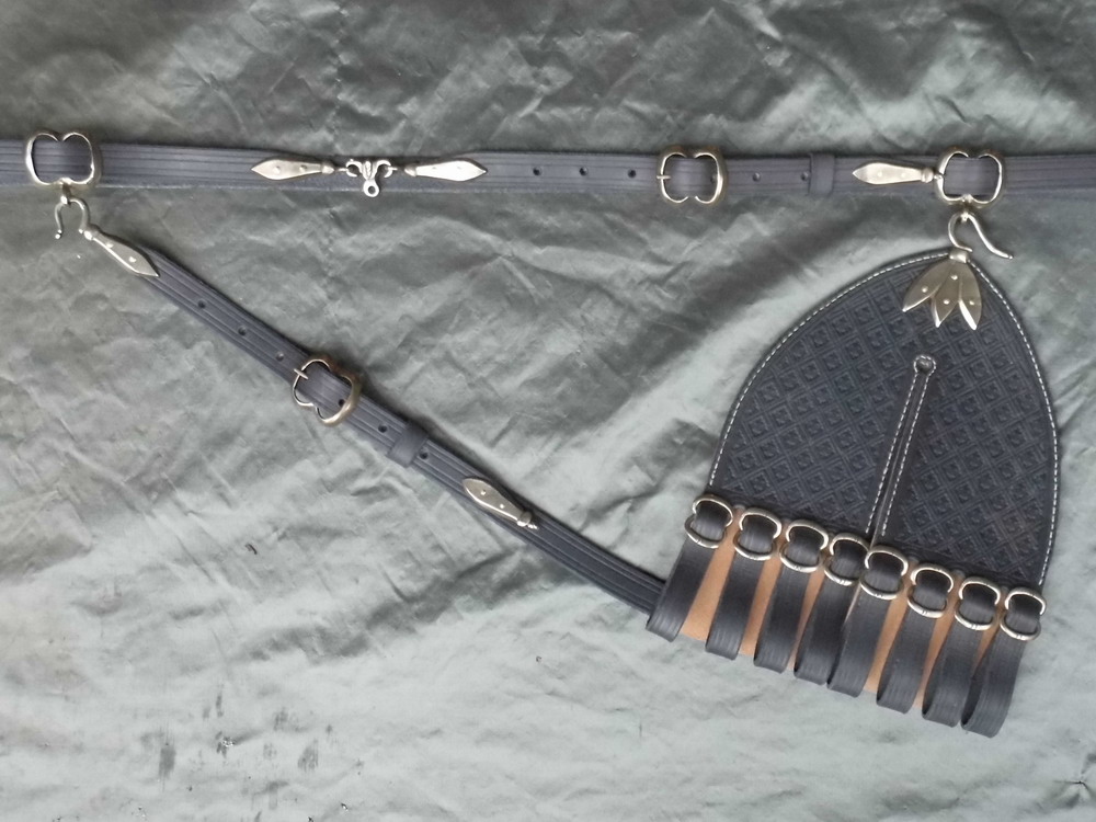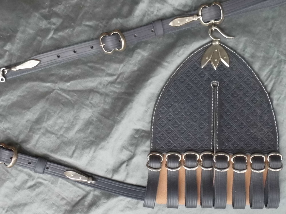 This sword hanger is made from oak gall black calf and cattle hide that has been dyed using period dyes and is made entirely by hand. The design for this hanger comes from a number of 16th and 17th century illustrations and surviving examples notably a surviving leather hanger in the Royal Armouries Museum in Leeds. It has cast bronze fittings with an adjustable waist belt and suspension strap and the suspension points can be moved to balance the sword correctly. It is highly decorated with incised lines and stamped tooling.