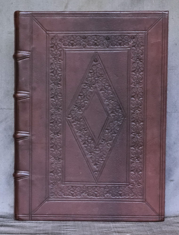 This facsimile book is covered with brown goat skin leather and is made by hand in the same way as they where in the 16th and 17th centuries. It has black and yellow headbands that reinforce the top and bottom of the spine. The paper is a high quality laid paper that has no water marks and there are 455 pages. The covers and spine are decorated with a blind tooling design copied from surviving examples from the same period as this was originally printed