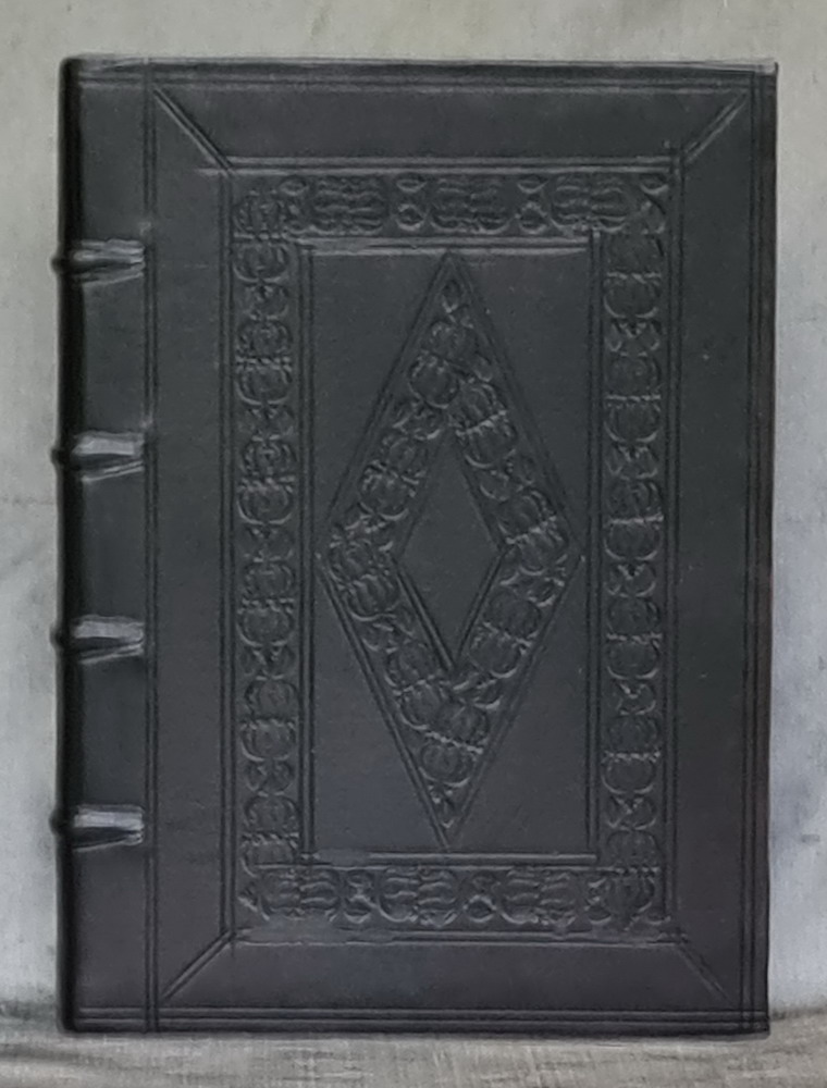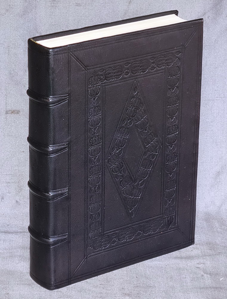 This facsimile book is covered with oak gall black goat skin leather and is made by hand in the same way as they where in the 16th and 17th centuries. It has black and yellow headbands that reinforce the top and bottom of the spine. The paper is a high quality laid paper that has no water marks and there are 455 pages. The covers and spine are decorated with a blind tooling design copied from surviving examples from the same period as this was originally printed