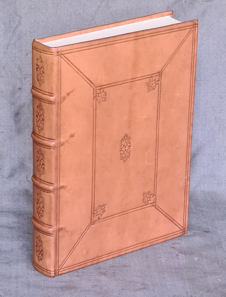 This facsimile book is covered with tan goat skin leather and is made by hand in the same way as they where in the 16th and 17th centuries. It has black and yellow headbands that reinforce the top and bottom of the spine. The paper is a high quality laid paper that has no water marks and there are 360 pages. There are three fold out correction pages that where added after binding to the original copy of this book. The covers and spine are decorated with a blind tooling design copied from surviving examples from the same period as this was originally printed