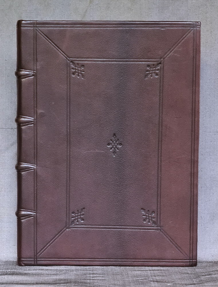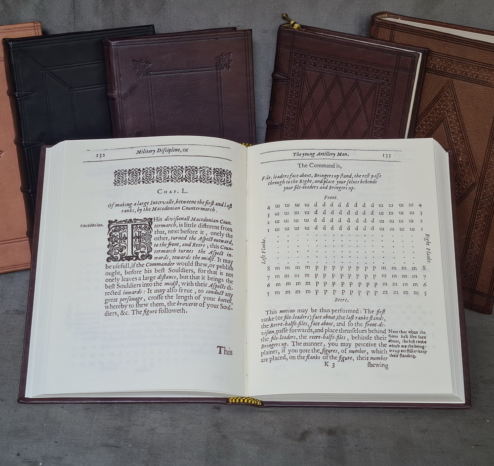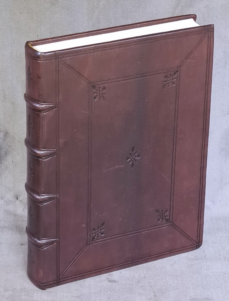 This facsimile book is covered with brown goat skin leather and is made by hand in the same way as they where in the 16th and 17th centuries. It has black and yellow headbands that reinforce the top and bottom of the spine. The paper is a high quality laid paper that has no water marks and there are 360 pages. There are three fold out correction pages that where added after binding to the original copy of this book. The covers and spine are decorated with a blind tooling design copied from surviving examples from the same period as this was originally printed