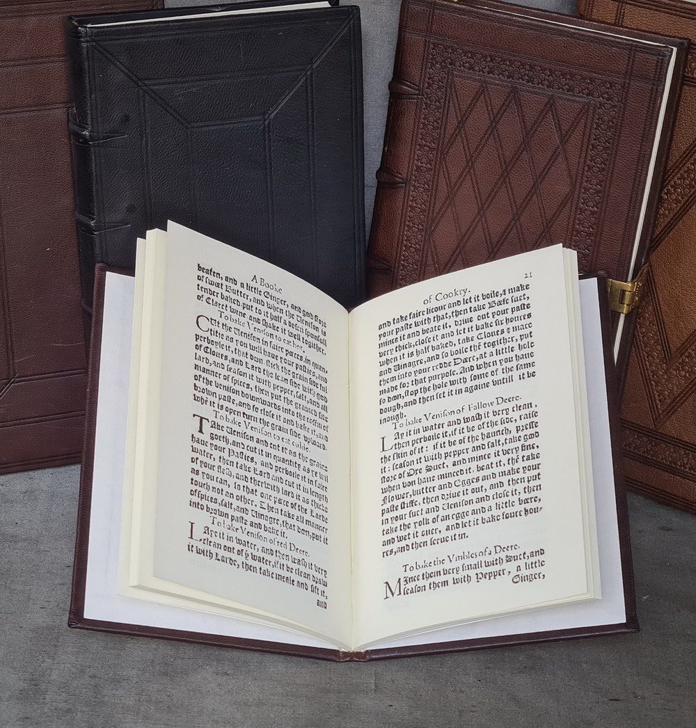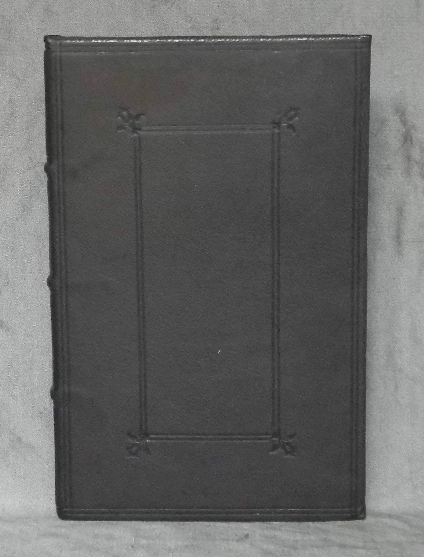 This facsimile book is covered with brown goat skin leather and is made by hand in the same way as they where in the 16th and 17th centuries. It has black and yellow headbands that reinforce the top and bottom of the spine. The paper is a high quality laid paper that has no water marks and there are 80 pages. The covers and spine are decorated with a blind tooling design copied from surviving examples from the same period as this was originally printed