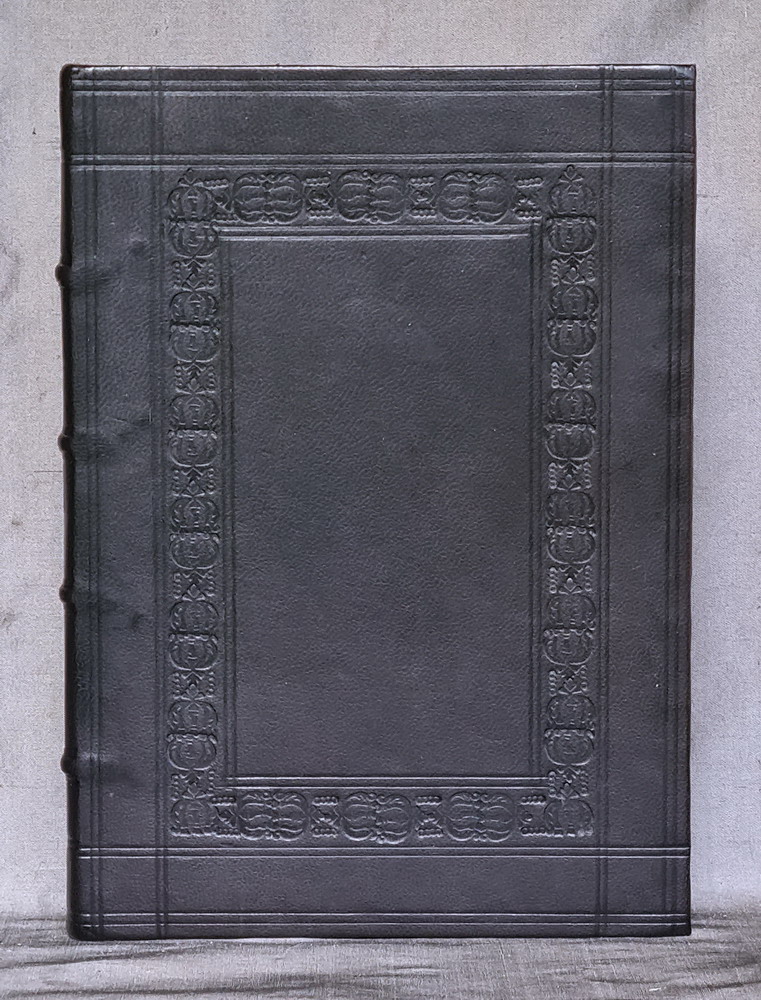 This facsimile book is covered with oak gall black goat skin leather and is made by hand in the same way as they where in the 16th and 17th centuries. It has black and yellow headbands that reinforce the top and bottom of the spine. The paper is a high quality laid paper that has no water marks and there are 255 pages. The covers and spine are decorated with a blind tooling design copied from surviving examples from the same period as this was originally printed