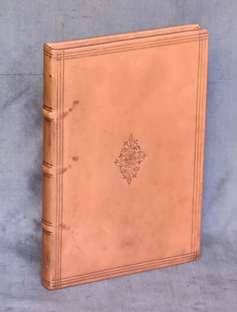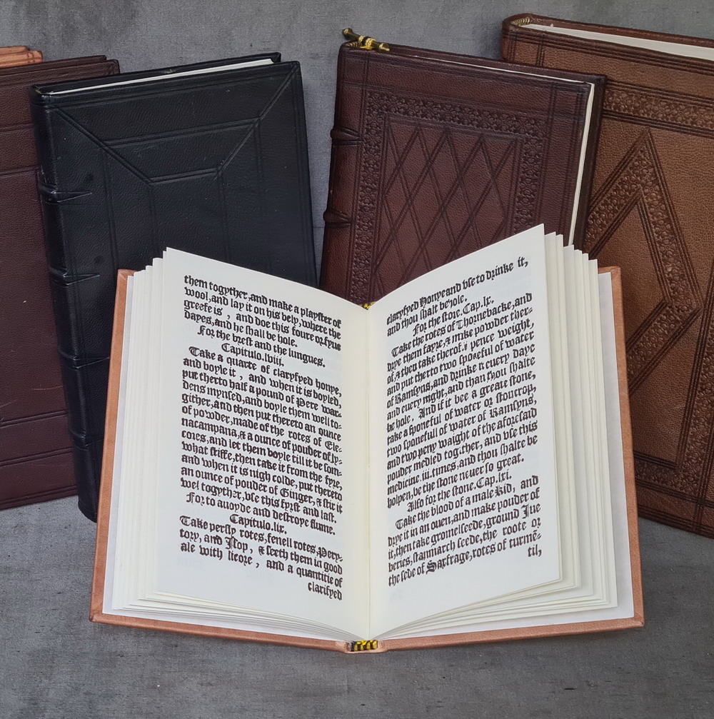 This facsimile book is covered with tan goat skin leather and is made by hand in the same way as they where in the 16th and 17th centuries. It has black and yellow headbands that reinforce the top and bottom of the spine. The paper is a high quality laid paper that has no water marks and there are 120 pages. The covers and spine are decorated with a blind tooling design copied from surviving examples from the same period as this was originally printed