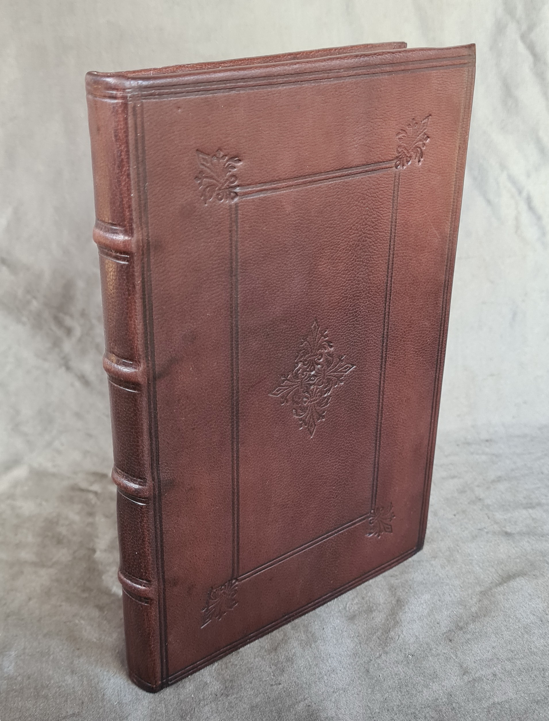 This facsimile book is covered with brown goat skin leather and is made by hand in the same way as they where in the 16th and 17th centuries. It has black and green headbands that reinforce the top and bottom of the spine. The paper is a high quality laid paper that has no water marks and there are 112 pages. The covers and spine are decorated with a blind tooling design copied from surviving examples from the same period as this was originally printed