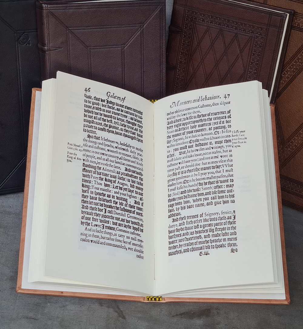 This facsimile book is covered with tan goat skin leather and is made by hand in the same way as they where in the 16th and 17th centuries. It has black and yellow headbands that reinforce the top and bottom of the spine. The paper is a high quality laid paper that has no water marks and there are 170 pages. The covers and spine are decorated with a blind tooling design copied from surviving examples from the same period as this was originally printed