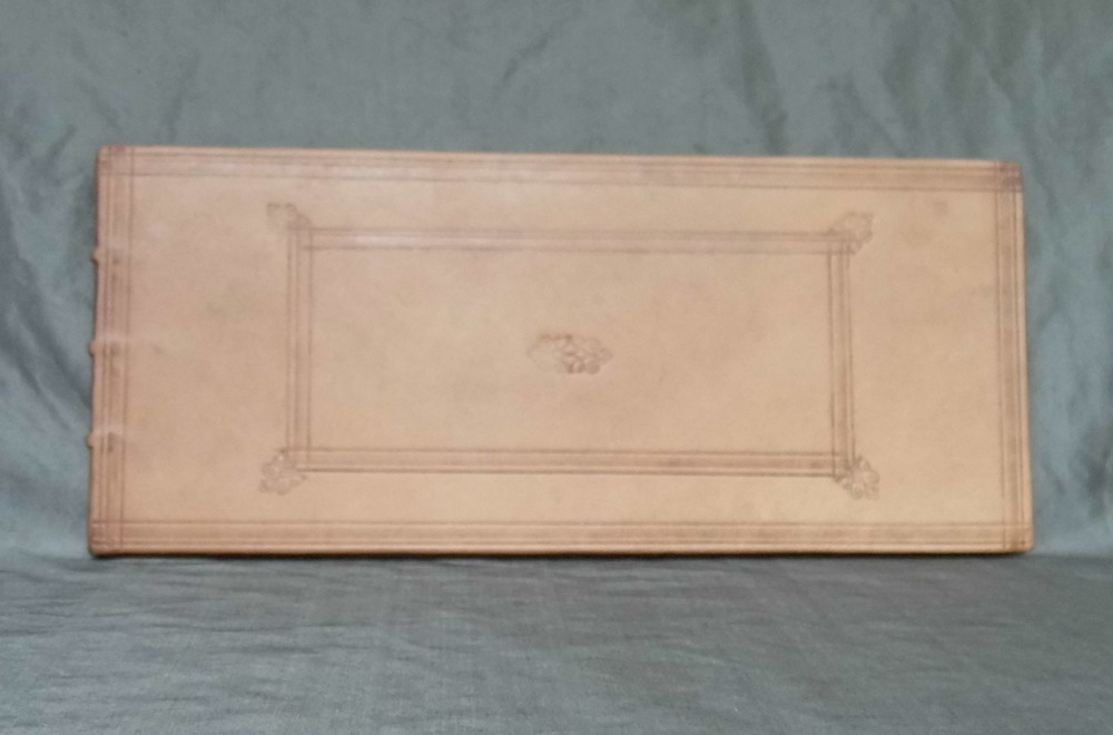 This facsimile book is covered with tan goat skin leather and is made by hand in the same way as they where in the 16th and 17th centuries. It has black and yellow headbands that reinforce the top and bottom of the spine. The paper is a high quality laid paper that has no water marks and there are 72 pages. The covers and spine are decorated with a blind tooling design copied from surviving examples from the same period as this was originally printed
