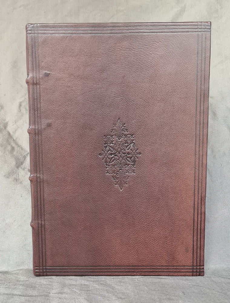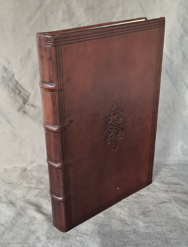 This facsimile book is covered with brown goat skin leather and is made by hand in the same way as they where in the 16th and 17th centuries. It has black and green headbands that reinforce the top and bottom of the spine. The paper is a high quality laid paper that has no water marks and there are 250 pages. The covers and spine are decorated with a blind tooling design copied from surviving examples from the same period as this was originally printed