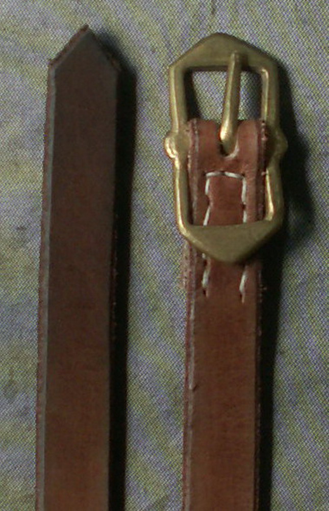 This is a stuart style belt with a brown 1/2 inch (12mm) wide strap. It is 56 inches (142cm) long. This style of buckle was in common use from 1620 - 1680