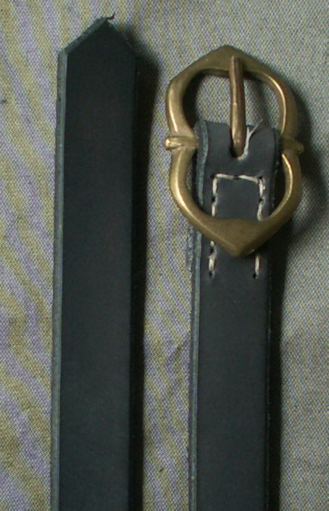 This is a tudor/stuart style belt with an oak gall black 5/8 inch (15mm) wide strap. It is 56 inches (143cm) long. This style of buckle was in common use from 1500 - 1650