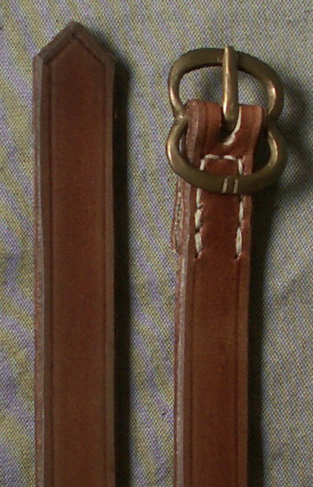 This is a Medieval to Stuart style belt with a brown 5/8 inch (15mm) wide strap. It is 55 inches (140cm) long. This style of buckle was in common use from 1350 - 1650