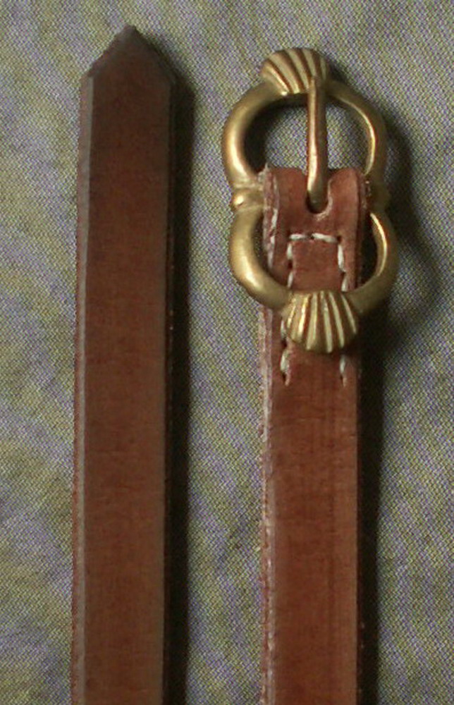 This is a tudor/stuart style belt with a brown 1/2 inch (16mm) wide strap. It is 56 inches (142cm) long. This style of buckle was in common use from 1550 - 1650