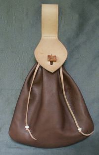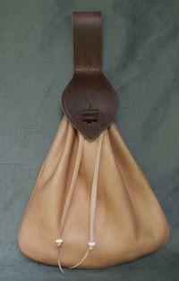 These belt bags are made from vegetable tanned calf and goat skins that have been dyed using period dyes and they are made entirely by hand. The design for this bag comes from illustrations in Boccaccio's Decameron 1430 and is a common style from the 15th century to the mid 16th century. They have a draw string bag and they hang from a belt loop. The more elaborate version has decorative tooling on the belt loop and fla and piping in the main seam.