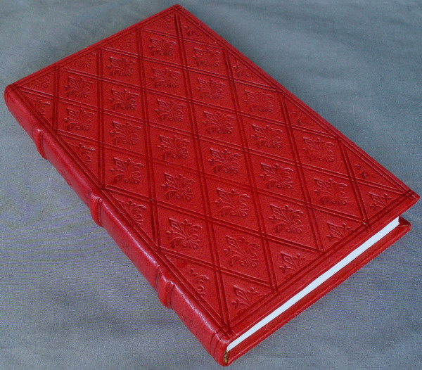 This leather bound note book note book is covered with brazilwood red goat skin and is made by hand in the same way as they where in the 16th and 17th centuries. It has black and yellow headbands that reinforce the top and bottom of the spine. The paper is a high quality laid paper that has no water marks and there are 128 pages. The covers and spine are decorated with a blind tooling design copied from surviving examples