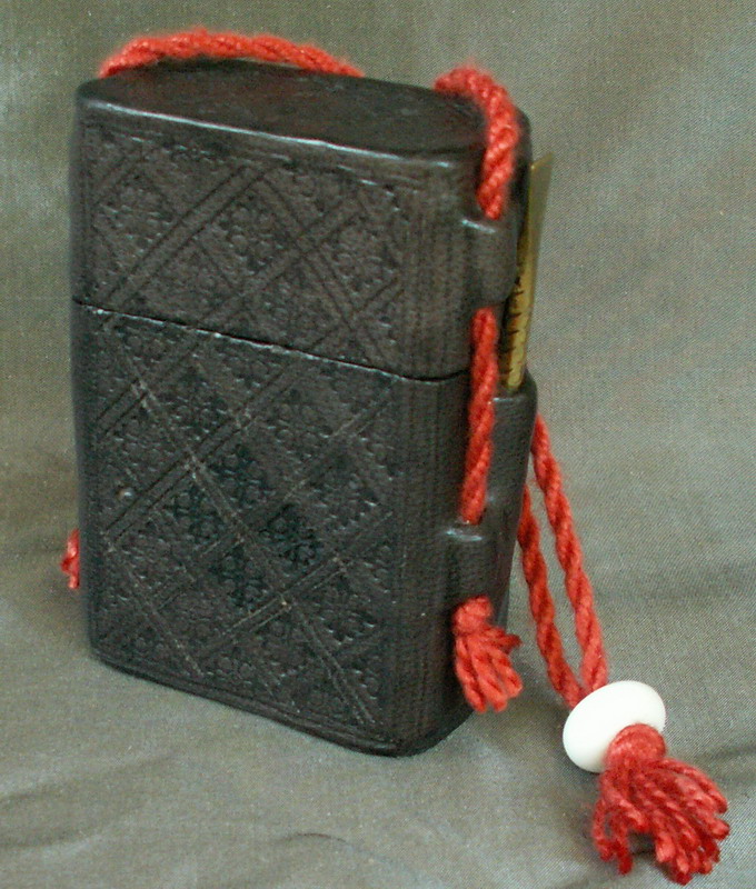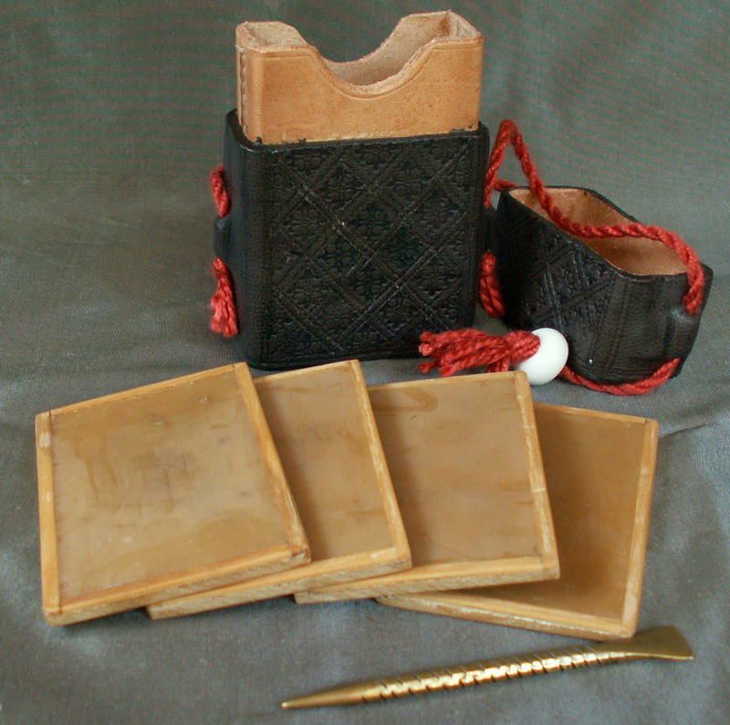 This wax tablet set is made from oak gall black goat and calf skin and is made entirely by hand. The design comes from illustrations in paintings and prints as well as a number of surviving examples. It is held closed with madder dyed silk cords and comes complete with four hand made boxwood tablets and a brass stylus.
