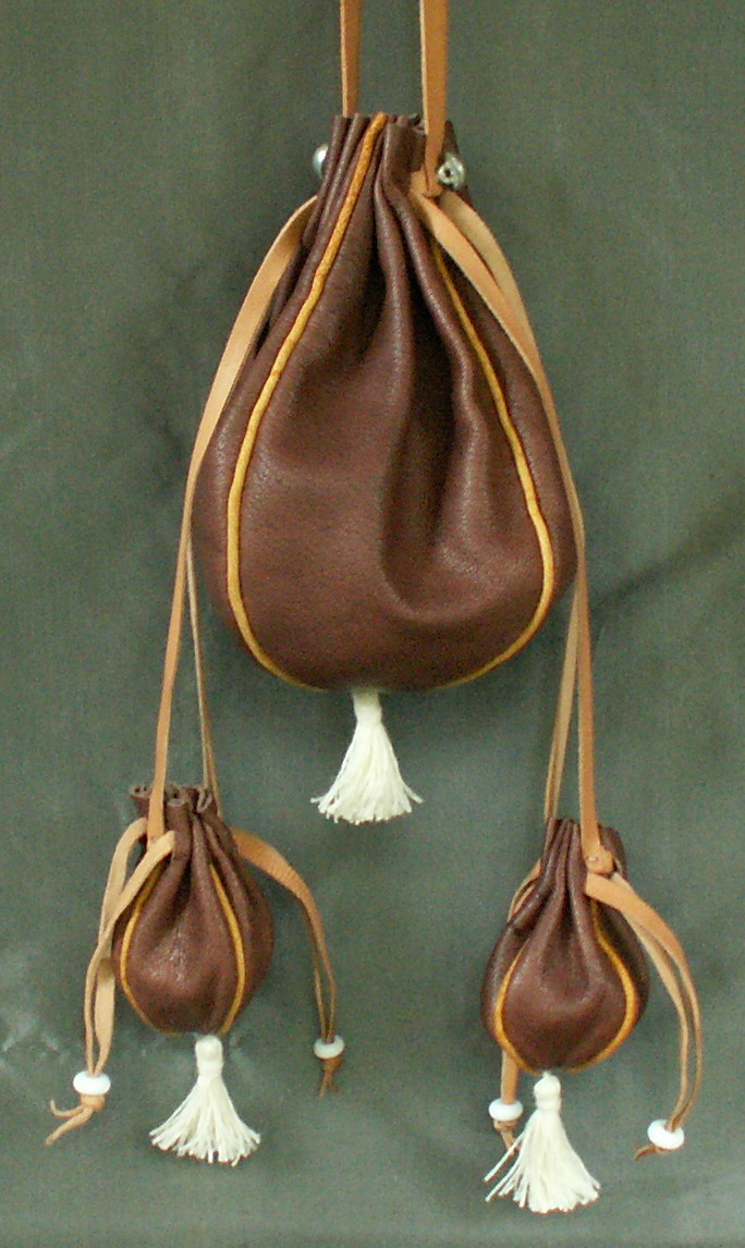 This purse is made from brown goat skin with tan piping and is stitched by hand. The design for this purse comes from a number of illustrations and surviving examples. It hangs from a leather cord and is held closed by two leather draw strings which each has a miniature purse on the end. It has decorative piped seams, hand made linen tassels and hand made grass beads.