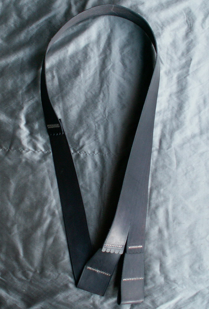 This baldric is made from oak gall black cattle hide and is stitched by hand. The design comes from a number of 17th century illustrations and surviving examples notably a cavalry troopers buff leather baldric in the Royal Armouries Museum in Leeds. All the seams are cross stitched and the ends of the straps are scalloped.