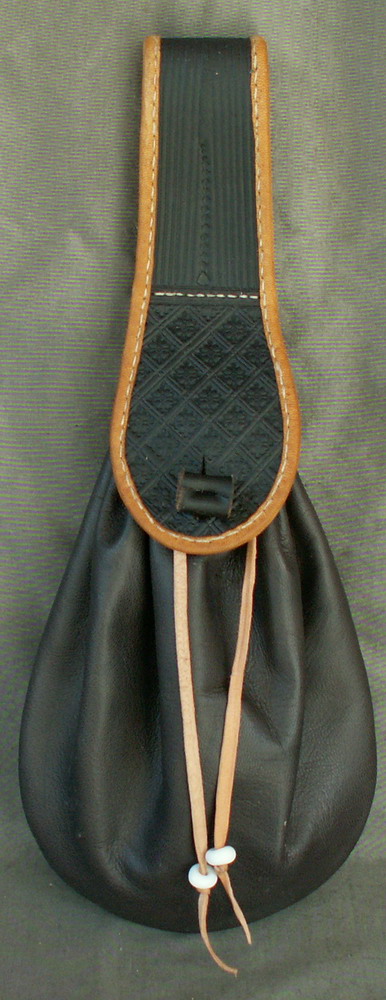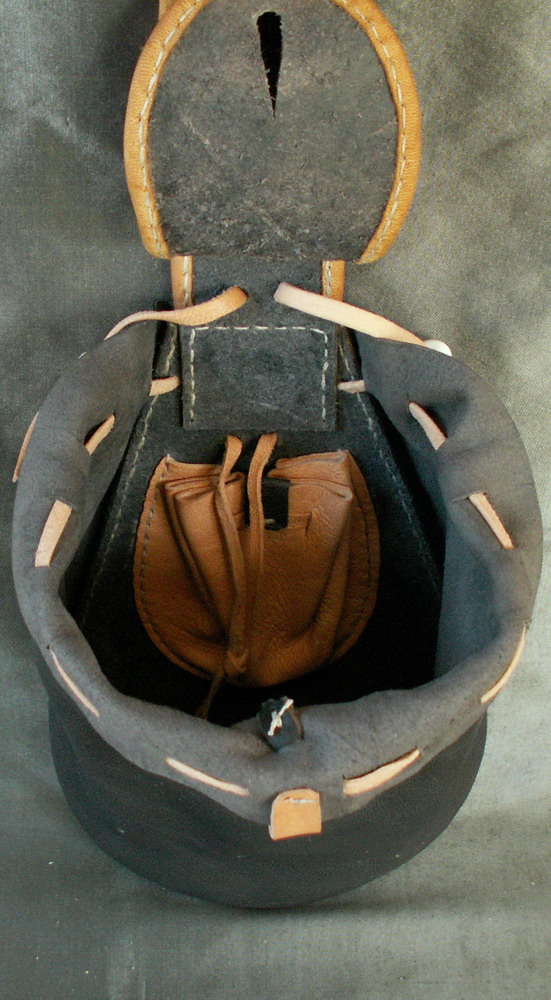 This purse is made from oak gall black goat and calf skin and is stitched by hand. The design for this purse comes from "Peasants Before an Inn" by Jan Steen 1653 and is a typical 17th century style. It has a draw string fronted bag with a stiff calf leather back and belt loop. The bag is kept close with a drawstring that has hand made beads on the ends and is covered with a button flap. The belt loop and button flap are decorated with a tooling design and the edges are bound with tan leather. Inside it has a separate coin purse with it's own drawstring.