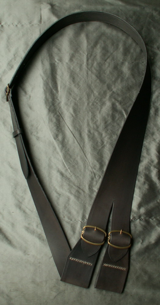 This baldric is made from oak gall black cattle hide and is stitched by hand. The design comes from a painting of Charles II Dancing at a Ball at Court 1660 by Hieronymus Janssens. It has three large brass buckles that allows the length to be adjusted and the seams are stitched with a decorative cross stitch.