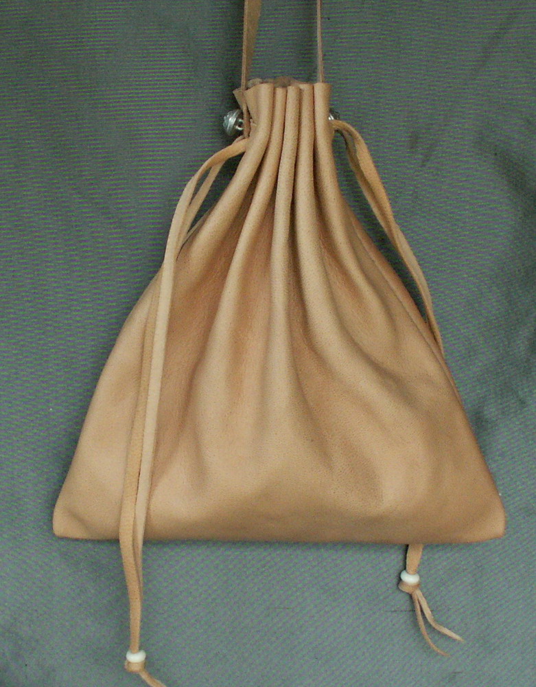 This purse is made from tan goat skin and is stitched by hand. The design for this purse comes from illustrations in "The Decameron" by Giovanni Boccaccio - 1430 and was a common style in the 14th and 15th centuries. It hangs from a leather cord and the top is held closed by two leather draw strings which have hand made beads on the ends.