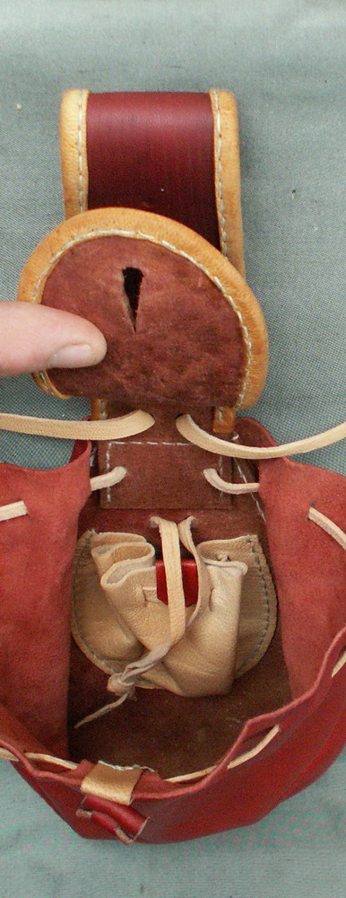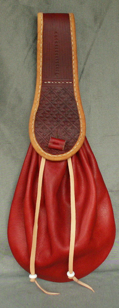 This purse is made from brazilwood red goat and oak gall black calf skin and is stitched by hand. The design for this purse comes from "Peasants Before an Inn" by Jan Steen 1653 and is a typical 17th century style. It has a draw string fronted bag with a stiff calf leather back and belt loop. The bag is kept close with a drawstring that has hand made beads on the ends and is covered with a button flap. The belt loop and button flap are decorated with a tooling design and the edges are bound with tan leather. Inside it has a separate coin purse with it's own drawstring.