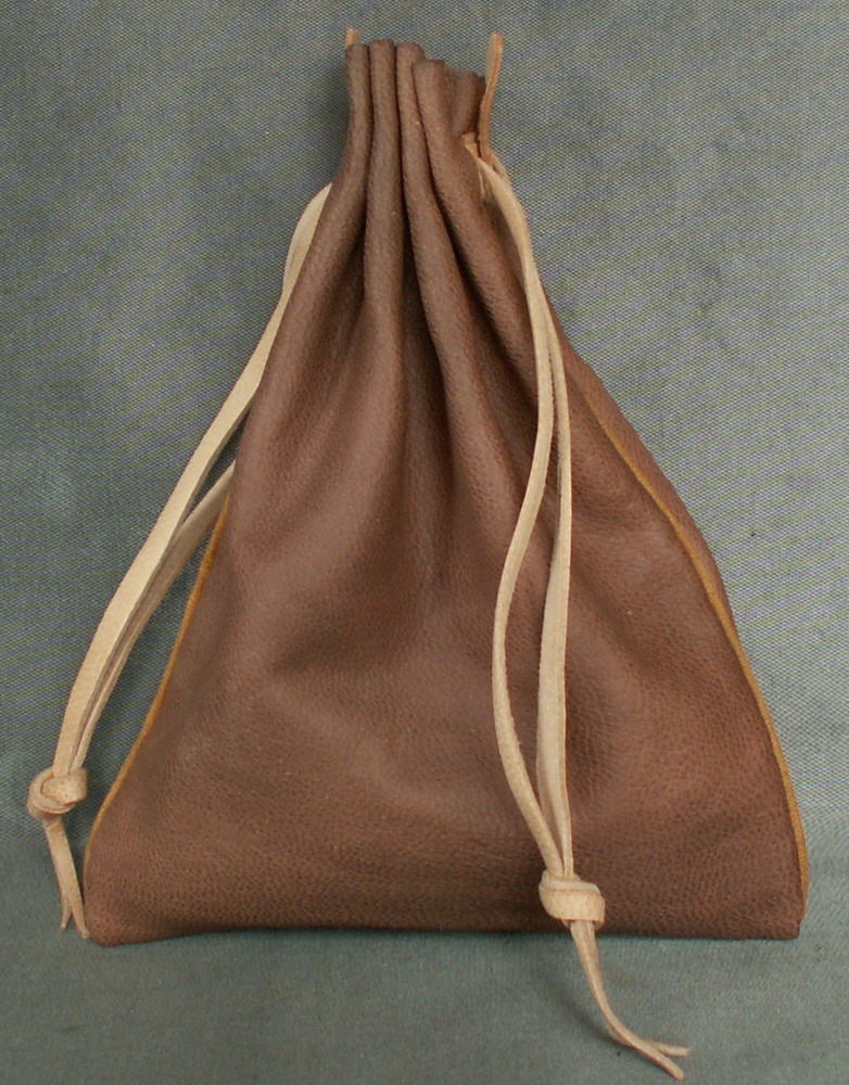 This purse is made from brown goat skin with tan piping and is stitched by hand. It is held closed with double leather drawstrings that have small tags attached which makes it easier to open the purse.